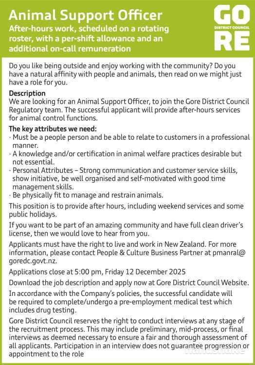 We are looking for an Animal Support Officer, to join the Gore District Council Regulatory team. The successful applicant will provide after-hours services for animal control functions.