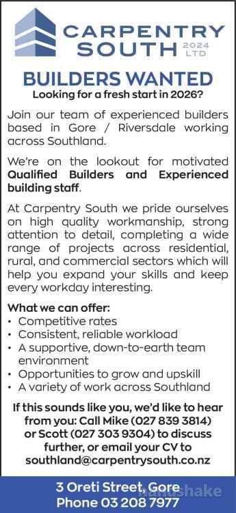 Looking for a fresh start in 2026? Join our team of experienced builders based in Gore/Riversdale working across Southland.