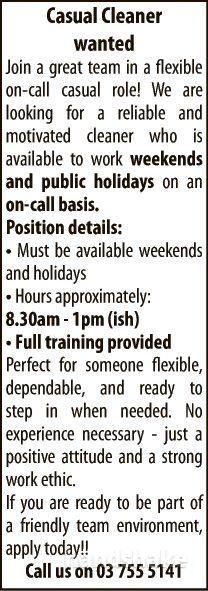 Join a great team in a flexible on-call casual role! We are looking for a reliable and motivated cleaner who is available to work weekends and public holidays on an on-call basis.