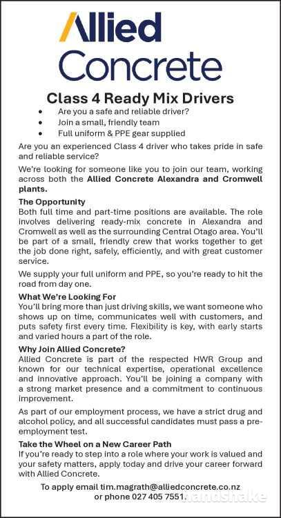 To apply email tim.magrath@alliedconcrete.co.nz or phone 0274057551.