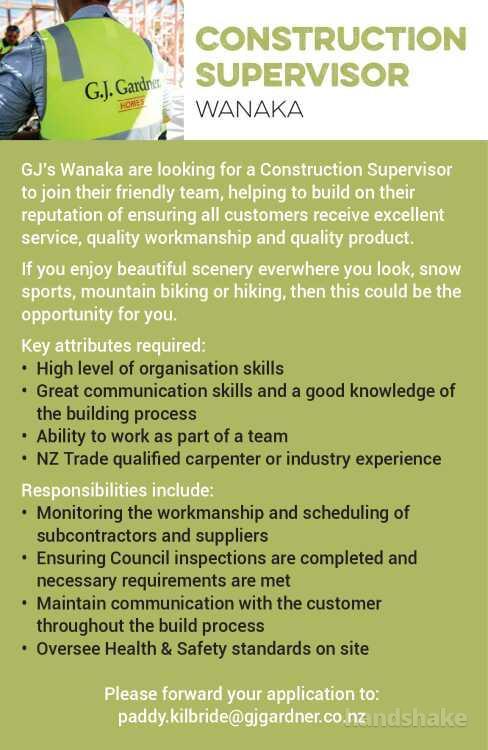 GJ’s Wanaka are looking for a Construction Supervisor to join their friendly team, helping to build on their reputation of ensuring all customers receive excellent service, quality workmanship and quality product.
