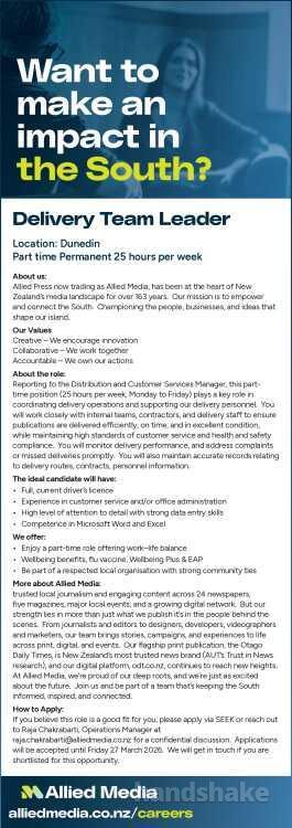 raja.chakrabarti@alliedmedia.co.nz for a confidential discussion. Applications will be accepted until Friday 27 March 2026. We will get in touch if you are shortlisted for this opportunity.