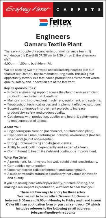 We are seeking two motivated and skilled engineers to join our team at our Oamaru textile manufacturing plant. This is a great opportunity to work in a fast-paced production environment where quality, safety, and innovation are at the forefront.