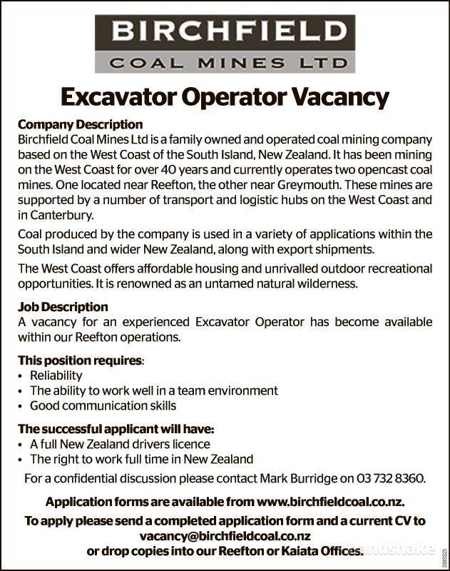 To apply please send a completed application form and a current CV to vacancy@birchfieldcoal.co.nz or drop copies into our Reefton or Kaiata Offices.