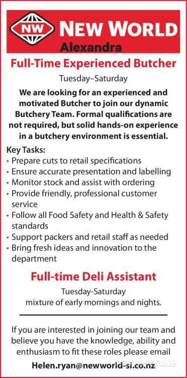 lf you are interested in joining our team and believe you have the knowledge, ability and enthusiasm to fit these roles please email Helen.ryan@newworld-si.co.nz