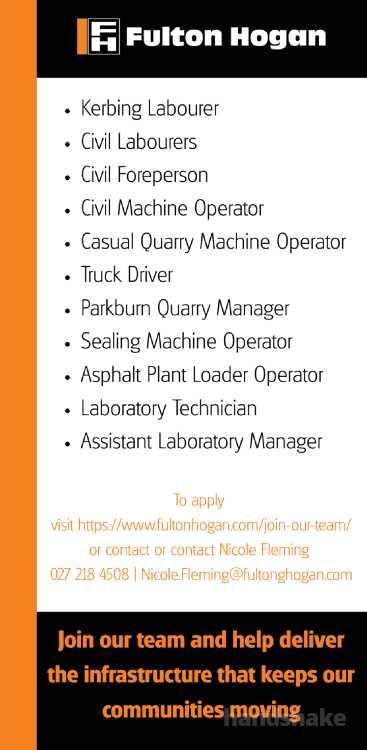 To apply visit https://www.fultonhogan.com/join-our-team/ or contact Nicole Fleming 027 218 4508 | Nicole.Fleming@fultonhogan.com