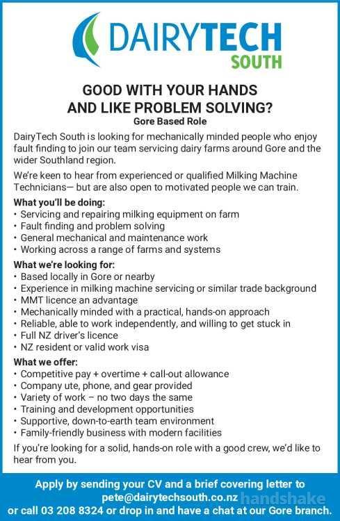 Apply by sending your CV and a brief covering letter to pete@dairytechsouth.co.nz or call 03 208 8324 or drop in and have a chat at our Gore branch.