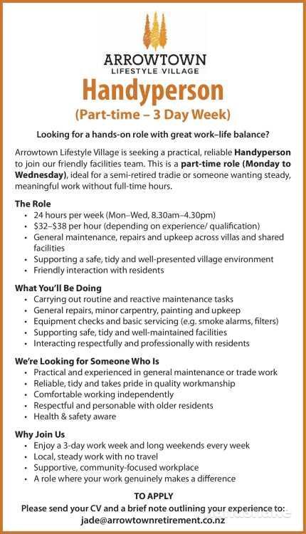 Arrowtown Lifestyle Village is seeking a practical, reliable Handyperson to join our friendly facilities team. This is a part-time role (Monday to Wednesday), ideal for a semi-retired tradie or someone wanting steady, meaningful work without full-time hours.