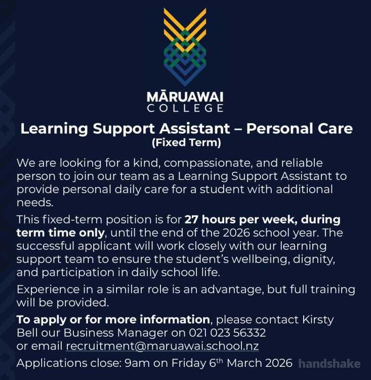 To apply or for more information, please contact Kirsty Bell our Business Manager on 021 023 56332 or email recruitment@maruawai.school.nz