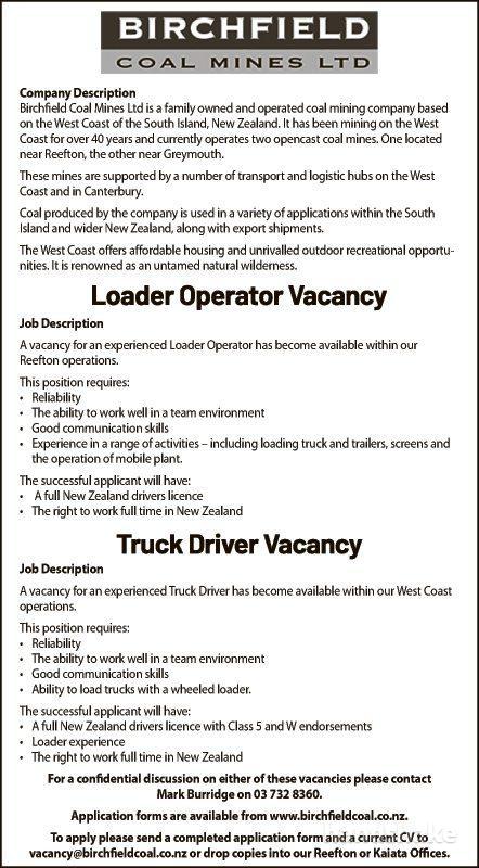To apply please send a completed application form and a current CV to vacancy@birchfieldcoal.co.nz or drop copies into our Reefton or Kaiata Offices.