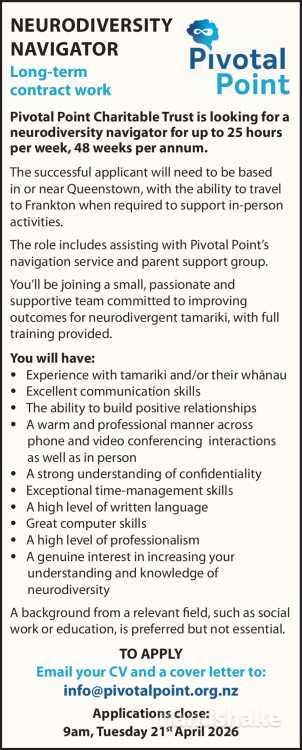 Pivotal Point Charitable Trust is looking for a neurodiversity navigator for up to 25 hours per week, 48 weeks per annum. The successful applicant will need to be based in or near Queenstown, with the ability to travel to Frankton when required to support in-person activities.