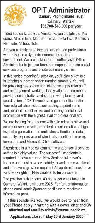 The position is fixed term, 40 hours per week based in Oamaru, Waitaki until June 2026. For further information please email admin@oamarupacific.nz to receive an information pack.