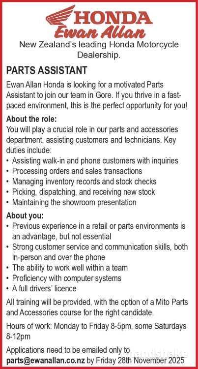 Ewan Allan Honda is looking for a motivated Parts Assistant to join our team in Gore. If you thrive in a fast-paced environment, this is the perfect opportunity for you!