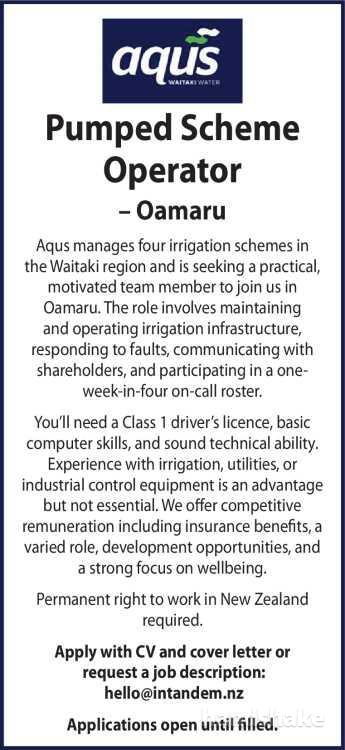 Oamaru. The role involves maintaining and operating irrigation infrastructure, responding to faults, communicating with