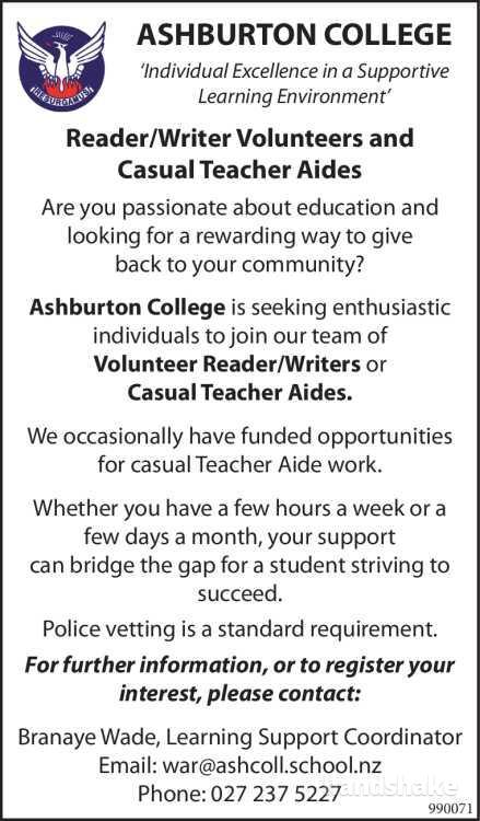 Ashburton College is seeking enthusiastic individuals to join our team of Volunteer Reader/Writers or Casual Teacher Aides. We occasionally have funded opportunities for casual Teacher Aide work.