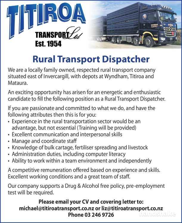 An exciting opportunity has arisen for an energetic and enthusiastic candidate to fill the following position as a Rural Transport Dispatcher.