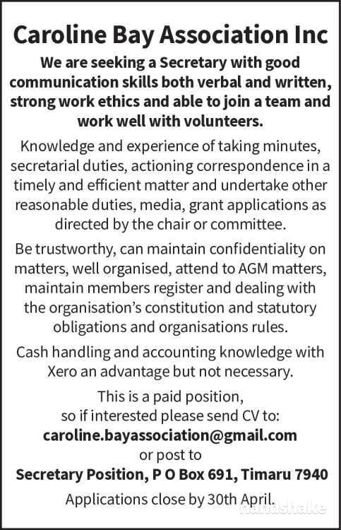 Secretary Position, P O Box 691, Timaru 7940