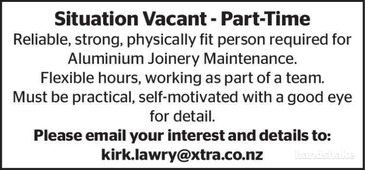 Reliable, strong, physically fit person required for Aluminium Joinery Maintenance.