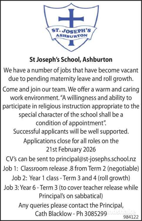 CV’s can be sent to principal@st-josephs.school.nz
