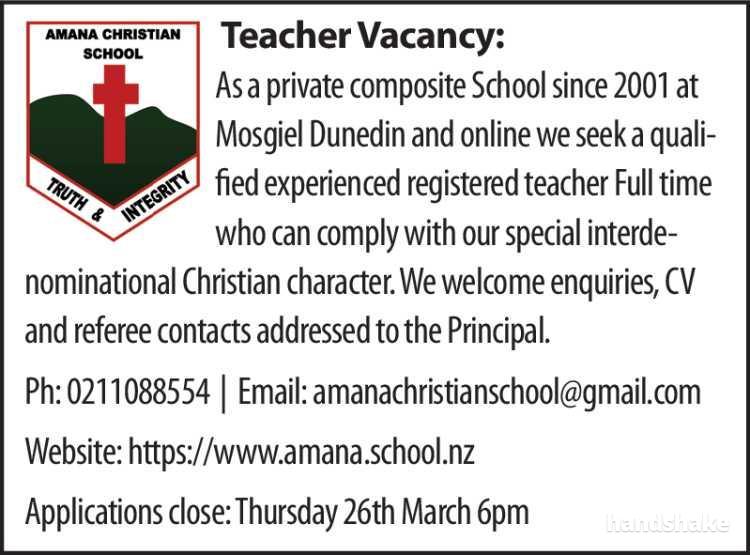 As a private composite School since 2001 at Mosgiel Dunedin and online we seek a qualified experienced registered teacher who can comply with our special interdenominational Christian character. We welcome enquiries, CV and referee contacts addressed to the Principal.