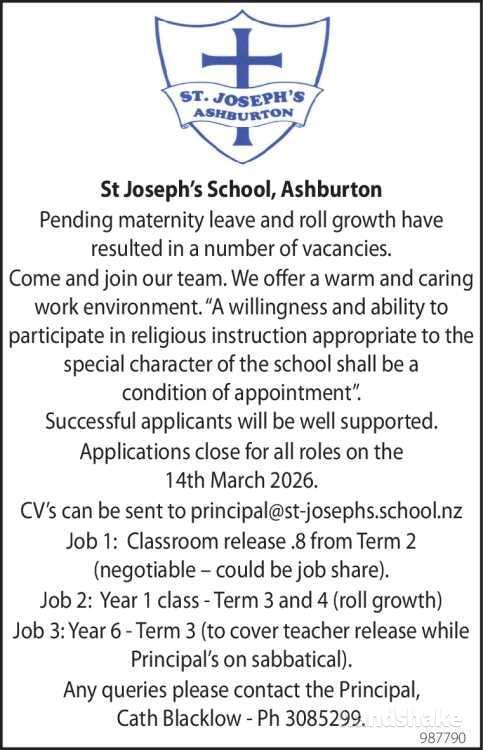 CV’s can be sent to principal@st-josephs.school.nz