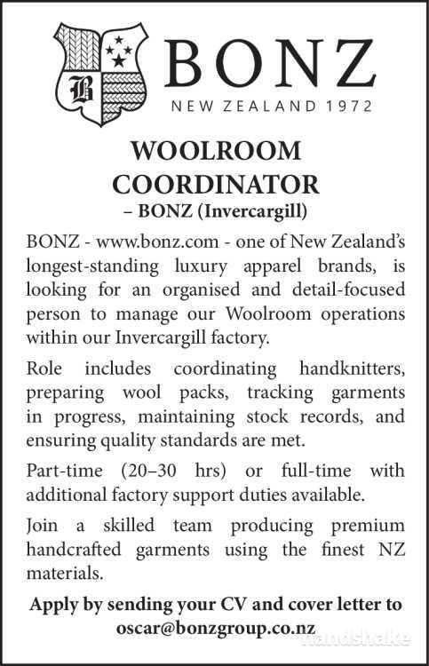 BONZ - www.bonz.com - one of New Zealand’s longest-standing luxury apparel brands, is looking for an organised and detail-focused person to manage our Woolroom operations