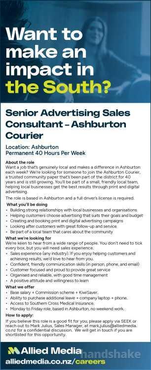 Want a job that’s genuinely local and makes a difference in Ashburton each week? We’re looking for someone to join the Ashburton Courier, a trusted community paper that’s been part of the district for 40 years and is still growing. You’ll be part of a small, friendly local team, helping local businesses get the best results through print and digital advertising.