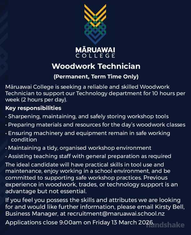 Maruawai College is seeking a reliable and skilled Woodwork