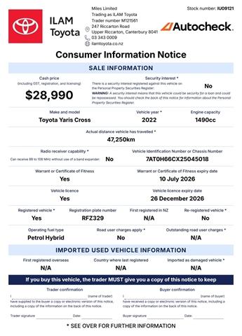 The 2022 Toyota Yaris Cross is the perfect compact SUV for those who want style, efficiency, and practicality in one smart package. With its elevated driving position, sleek design, and impressive fuel economy, it's ideal for city commuting while still being ready for weekend getaways. Inside, you'll find a modern, well-appointed cabin with intuitive infotainment and advanced safety features, giving you comfort and confidence on every drive. Compact yet surprisingly spacious, the Yaris Cross offers the versatility you need without compromising on performance. Don't miss your chance to own this popular SUV. available now at ILAM Toyota. Toyota Certified Benefits: You're looking at a Toyota Certified Used Vehicle. Which means, it comes with 24/7 Roadside Assist and a 1 Year/15,000km warranty. Also, continue to service with a Toyota Store and get Toyota Service Protect, and you’ll receive 1 year additional warranty with every qualifying service if your vehicle is under 10 years old or 150,000km. Terms & conditions apply. Visit our website for details. Learn More About This Vehicle: Speak to our friendly team using the enquiry form below. We look forward to hearing from you! Alternatively, arrange a presentation and test drive of this vehicle at a time that best suits you. Transport can be arranged nationwide. Trust ILAM Toyota: We have been helping customers from all over NZ find their Perfect Match since 1987. Your experience just doesn't stop when you collect your new vehicle. Our dedicated team prides itself on its aftersales service also. This includes friendly personalised WOF and Service reminders, free service loan vehicles, pick-up and delivery and an Uber service. Here For Your Convenience 7 Days: Mon-Fri: 8am-5.30pm Sat: 9am-5pm Sun: 10am-4pm Haven't Found What You're Looking For: ILAM Toyota has one of the largest line-ups of pre-loved passenger and commercial Toyotas. With new stock arriving weekly, please let us know if this vehicle isnt your Perfect Match it might just not be listed yet. We have an extensive range of vehicles from economical family cars, hatchbacks, station wagons, SUVs, vans and utes, both NZ new or Imported. Brands focus on safety, fuel efficient hybrid, plug in hybrid (PHEV) and electric (BEV) with 2 keys, service history and owners manual included where possible. Finance / Insurance / Extra Care: Our team of dedicated finance and insurance specialists are on site to help assist you into your new vehicle with a range of Personalised Finance options through Toyota Financial Services. We can also assist with vehicle insurance, extended warranties and service plans to help protect your investment. Dealer Stock No : IU09121 All features:5 Door, Imported
