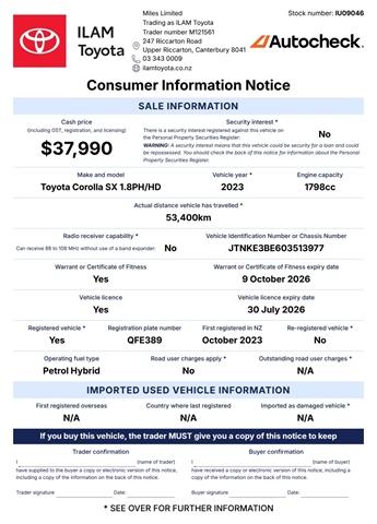 Experience the perfect blend of style, efficiency, and performance with the 2023 Toyota Corolla SX 1.8PH. This sleek and modern hatchback features a powerful 1.8 litre hybrid engine paired with a smooth 10-speed continuously variable transmission (CVT), ensuring a dynamic and responsive driving experience. With advanced safety features, cutting-edge technology, and impressive fuel efficiency, the Corolla SX is designed to elevate your daily commute and weekend adventures. Enjoy the comfort of a spacious interior, premium materials, and intuitive controls, all while turning heads with its striking exterior design. Discover why the 2024 Toyota Corolla SX is the smart choice for drivers who demand more from their vehicle. Toyota Certified Benefits: You're looking at a Toyota Certified Used Vehicle. Which means, it comes with 24/7 Roadside Assist and a 1 Year/15,000km warranty. Also, continue to service with a Toyota Store and get Toyota Service Protect, and you’ll receive 1 year additional warranty with every qualifying service if your vehicle is under 10 years old or 150,000km. Terms & conditions apply. Visit our website for details. Learn More About This Vehicle: Speak to our friendly team using the enquiry form below. We look forward to hearing from you! Alternatively, arrange a presentation and test drive of this vehicle at a time that best suits you. Transport can be arranged nationwide. Trust ILAM Toyota: We have been helping customers from all over NZ find their Perfect Match since 1987. Your experience just doesn't stop when you collect your new vehicle. Our dedicated team prides itself on its aftersales service also. This includes friendly personalised WOF and Service reminders, free service loan vehicles, pick-up and delivery and an Uber service. Here For Your Convenience 7 Days: Mon-Fri: 8am-5.30pm Sat: 9am-5pm Sun: 10am-4pm Haven't Found What You're Looking For: ILAM Toyota has one of the largest line-ups of pre-loved passenger and commercial Toyotas. With new stock arriving weekly, please let us know if this vehicle isnt your Perfect Match it might just not be listed yet. We have an extensive range of vehicles from economical family cars, hatchbacks, station wagons, SUVs, vans and utes, both NZ new or Imported. Brands focus on safety, fuel efficient hybrid, plug in hybrid (PHEV) and electric (BEV) with 2 keys, service history and owners manual included where possible. Finance / Insurance / Extra Care: Our team of dedicated finance and insurance specialists are on site to help assist you into your new vehicle with a range of Personalised Finance options through Toyota Financial Services. We can also assist with vehicle insurance, extended warranties and service plans to help protect your investment. Dealer Stock No : IU09046 All features:5 Door, Parking Sensors, NZ New