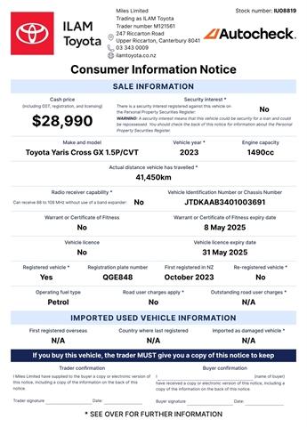 The 2023 Toyota Yaris Cross Petrol GX in Golden Ore is one of New Zealand's most popular small cars, ready to get you around safely and efficiently! This NZ new GX model is a well appointed car with safety features that you'll love! "The Yaris Cross is presented as fun to drive, agile and has a bit of a 'go-anywhere robustness' that you'd expect from a bigger SUV, and feels surprisingly similar to the smaller and cheaper Suzuki Ignis Micro SUV" - AA PERFORMANCE 1.5L Petrol 138g/km CO2 Emissions 6L/100 km Fuel Economy Eco, Normal, Sport SAFETY 5-Star ANCAP Safety Reverse Camera Radar Cruise Control Pre Collision System Lane Alert COMFORT & STYLE Bluetooth If you're looking for an economical and stylish small car with premium safety features from a car brand with a history of reliability at an official Toyota dealership with a reputation that preceeds itself, then come on in for a look at ILAM Toyota! Toyota Certified Benefits: You're looking at a Toyota Certified Used Vehicle. Which means, it comes with 24/7 Roadside Assist and a 1 Year/15,000km warranty. Also, continue to service with a Toyota Store and get Toyota Service Protect, and you’ll receive 1 year additional warranty with every qualifying service if your vehicle is under 10 years old or 150,000km. Terms & conditions apply. Visit our website for details. Learn More About This Vehicle: Speak to our friendly team using the enquiry form below. We look forward to hearing from you! Alternatively, arrange a presentation and test drive of this vehicle at a time that best suits you. Transport can be arranged nationwide. Trust ILAM Toyota: We have been helping customers from all over NZ find their Perfect Match since 1987. Your experience just doesn't stop when you collect your new vehicle. Our dedicated team prides itself on its aftersales service also. This includes friendly personalised WOF and Service reminders, free service loan vehicles, pick-up and delivery and an Uber service. Here For Your Convenience 7 Days: Mon-Fri: 8am-5.30pm Sat: 9am-5pm Sun: 10am-4pm Haven't Found What You're Looking For: ILAM Toyota has one of the largest line-ups of pre-loved passenger and commercial Toyotas. With new stock arriving weekly, please let us know if this vehicle isnt your Perfect Match it might just not be listed yet. We have an extensive range of vehicles from economical family cars, hatchbacks, station wagons, SUVs, vans and utes, both NZ new or Imported. Brands focus on safety, fuel efficient hybrid, plug in hybrid (PHEV) and electric (BEV) with 2 keys, service history and owners manual included where possible. Finance / Insurance / Extra Care: Our team of dedicated finance and insurance specialists are on site to help assist you into your new vehicle with a range of Personalised Finance options through Toyota Financial Services. We can also assist with vehicle insurance, extended warranties and service plans to help protect your investment. Dealer Stock No : IU08819 All features:5 Door, NZ New