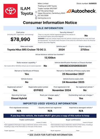 This 2024 Toyota Hilux SR5 Cruiser in White is available now here at ILAM Toyota. The Hilux has been one of New Zealand's most loved and trusted Utes for generations and this one is ready for your next off-road adventure! This SR5 Cruiser comes equipped with a Light Bar, Tow Bar, Tuff Deck, Side Steps and a Canopy, ready for any adventure or to get the job done! Positioned above the SR5 model, this truck also has leather, heated front seats, upgraded stereo, 18" alloys, Blind Spot Monitors and parking sensors. ''The ute is a common sight on New Zealand roads. Of all the utes out there, few are better known than the Toyota Hilux. Whether its the memorable advertisements, demonstrations of its capability or if you watched Top Gears attempts to obliterate one, the Hilux enjoys household name status within New Zealand.'' - Drivelife PERFORMANCE 2.8L Diesel Turbo Engine 150kw 500NM 3500kg Tow rating SAFETY 5-Star ANCAP Safety Reverse Camera Radar Cruise Control Forward Collision Alert Lane Departure Assist COMFORT & STYLE Leather Heated front seats Bluetooth Apple Car Play / Android Auto Dual Air Conditioning This is your opportunity to buy a well specced Hilux and avoid any potential wait times. If you're looking for a quality and reliable top of the market ute, don't look past this awesome opportunity at ILAM Toyota here in Christchurch! Toyota Certified Benefits: You're looking at a Toyota Certified Used Vehicle. Which means, it comes with 24/7 Roadside Assist and a 1 Year/15,000km warranty. Also, continue to service with a Toyota Store and get Toyota Service Protect, and you’ll receive 1 year additional warranty with every qualifying service if your vehicle is under 10 years old or 150,000km. Terms & conditions apply. Visit our website for details. Learn More About This Vehicle: Speak to our friendly team using the enquiry form below. We look forward to hearing from you! Alternatively, arrange a presentation and test drive of this vehicle at a time that best suits you. Transport can be arranged nationwide. Trust ILAM Toyota: We have been helping customers from all over NZ find their Perfect Match since 1987. Your experience just doesn't stop when you collect your new vehicle. Our dedicated team prides itself on its aftersales service also. This includes friendly personalised WOF and Service reminders, free service loan vehicles, pick-up and delivery and an Uber service. Here For Your Convenience 7 Days: Mon-Fri: 8am-5.30pm Sat: 9am-5pm Sun: 10am-4pm Haven't Found What You're Looking For: ILAM Toyota has one of the largest line-ups of pre-loved passenger and commercial Toyotas. With new stock arriving weekly, please let us know if this vehicle isnt your Perfect Match it might just not be listed yet. We have an extensive range of vehicles from economical family cars, hatchbacks, station wagons, SUVs, vans and utes, both NZ new or Imported. Brands focus on safety, fuel efficient hybrid, plug in hybrid (PHEV) and electric (BEV) with 2 keys, service history and owners manual included where possible. Finance / Insurance / Extra Care: Our team of dedicated finance and insurance specialists are on site to help assist you into your new vehicle with a range of Personalised Finance options through Toyota Financial Services. We can also assist with vehicle insurance, extended warranties and service plans to help protect your investment. Dealer Stock No : IU08925 All features:4 Door, 2 Sets Of Keys, NZ New,4WD