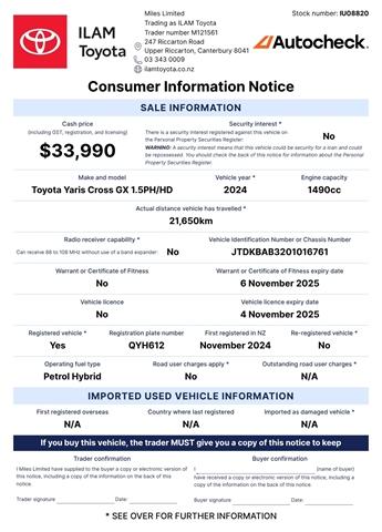 The 2024 Toyota Yaris Cross Hybrid in Ruby Red is one of New Zealand's most popular small cars, ready to get you around safely and efficiently! This NZ new GX model is a well appointed car with safety features that you'll love! "The Yaris Cross is presented as fun to drive, agile and has a bit of a ''go-anywhere robustness'' that you'd expect from a bigger SUV, and feels surprisingly similar to the smaller and cheaper Suzuki Ignis Micro SUV" - AA PERFORMANCE 1.5L Petrol Hybrid 84g /km CO2 Emissions 3.6L /100 km Fuel Economy Eco, Normal, Sport and EV driving modes SAFETY 5-Star ANCAP Safety Reverse Camera Radar Cruise Control Pre Collision System Lane Alert COMFORT & STYLE Bluetooth Apple Carplay/Android Auto If you're looking for an economical and stylish small car with premium safety features from a car brand with a history of reliability at an official Toyota dealership with a reputation that preceeds itself, then come on in for a look at ILAM Toyota! Toyota Certified Benefits: You're looking at a Toyota Certified Used Vehicle. Which means, it comes with 24/7 Roadside Assist and a 1 Year/15,000km warranty. Also, continue to service with a Toyota Store and get Toyota Service Protect, and you’ll receive 1 year additional warranty with every qualifying service if your vehicle is under 10 years old or 150,000km. Terms & conditions apply. Visit our website for details. Learn More About This Vehicle: Speak to our friendly team using the enquiry form below. We look forward to hearing from you! Alternatively, arrange a presentation and test drive of this vehicle at a time that best suits you. Transport can be arranged nationwide. Trust ILAM Toyota: We have been helping customers from all over NZ find their Perfect Match since 1987. Your experience just doesn't stop when you collect your new vehicle. Our dedicated team prides itself on its aftersales service also. This includes friendly personalised WOF and Service reminders, free service loan vehicles, pick-up and delivery and an Uber service. Here For Your Convenience 7 Days: Mon-Fri: 8am-5.30pm Sat: 9am-5pm Sun: 10am-4pm Haven't Found What You're Looking For: ILAM Toyota has one of the largest line-ups of pre-loved passenger and commercial Toyotas. With new stock arriving weekly, please let us know if this vehicle isnt your Perfect Match it might just not be listed yet. We have an extensive range of vehicles from economical family cars, hatchbacks, station wagons, SUVs, vans and utes, both NZ new or Imported. Brands focus on safety, fuel efficient hybrid, plug in hybrid (PHEV) and electric (BEV) with 2 keys, service history and owners manual included where possible. Finance / Insurance / Extra Care: Our team of dedicated finance and insurance specialists are on site to help assist you into your new vehicle with a range of Personalised Finance options through Toyota Financial Services. We can also assist with vehicle insurance, extended warranties and service plans to help protect your investment. Dealer Stock No : IU08820 All features:5 Door, NZ New