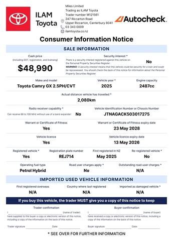 Presenting the remarkable 2025 Toyota Camry Petrol Hybrid, a sedan that effortlessly combines safety, power, and reliability to elevate your driving experience. Equipped with cutting-edge safety technologies, including advanced Toyota Safety Sense and multiple airbags, this Camry ensures your peace of mind on every journey. The 2.5L Hybrid powertrain delivers impressive power while maintaining excellent fuel efficiency, granting you seamless acceleration and an enjoyable ride. Renowned for its legendary reliability, the Camry offers worry-free ownership. This Ex-Demonstrator does not qualify for any new vehicle offers from Toyota New Zealand. Learn More About This Vehicle: Speak to our friendly team using the enquiry form below. We look forward to hearing from you! Alternatively, arrange a presentation and test drive of this vehicle at a time that best suits you. Transport can be arranged nationwide. Trust ILAM Toyota: We have been helping customers from all over NZ find their Perfect Match since 1987. Your experience just doesn't stop when you collect your new vehicle. Our dedicated team prides itself on its aftersales service also. This includes friendly personalised WOF and Service reminders, free service loan vehicles, pick-up and delivery and an Uber service. Here For Your Convenience 7 Days: Mon-Fri: 8am-5.30pm Sat: 9am-5pm Sun: 10am-4pm Haven't Found What You're Looking For: ILAM Toyota has one of the largest line-ups of pre-loved passenger and commercial Toyotas. With new stock arriving weekly, please let us know if this vehicle isnt your Perfect Match it might just not be listed yet. We have an extensive range of vehicles from economical family cars, hatchbacks, station wagons, SUVs, vans and utes, both NZ new or Imported. Brands focus on safety, fuel efficient hybrid, plug in hybrid (PHEV) and electric (BEV) with 2 keys, service history and owners manual included where possible. Finance / Insurance / Extra Care: Our team of dedicated finance and insurance specialists are on site to help assist you into your new vehicle with a range of Personalised Finance options through Toyota Financial Services. We can also assist with vehicle insurance, extended warranties and service plans to help protect your investment. Dealer Stock No : IP00642 All features:5 Door, NZ New