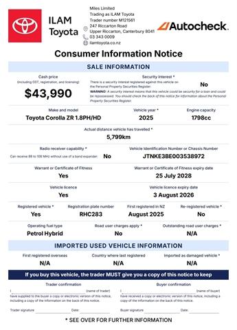 The 2025 Toyota Corolla ZR Hybrid 1.8 blends sporty styling with impressive hybrid efficiency. Powered by Toyota's smooth 1.8L petrol-hybrid system and automatic transmission, it delivers responsive performance with outstanding fuel economy of around 3.9L/100km. As the top-spec ZR model, it features premium interior finishes, advanced technology, and Toyota's latest safety features, making it a stylish and practical hatch for everyday driving. Available now at ILAM Toyota, come and see the team today. Toyota Certified Benefits: You're looking at a Toyota Certified Used Vehicle. Which means, it comes with 24/7 Roadside Assist and a 1 Year/15,000km warranty. Also, continue to service with a Toyota Store and get Toyota Service Protect, and you’ll receive 1 year additional warranty with every qualifying service if your vehicle is under 10 years old or 150,000km. Terms & conditions apply. Visit our website for details. Learn More About This Vehicle: Speak to our friendly team using the enquiry form below. We look forward to hearing from you! Alternatively, arrange a presentation and test drive of this vehicle at a time that best suits you. Transport can be arranged nationwide. Trust ILAM Toyota: We have been helping customers from all over NZ find their Perfect Match since 1987. Your experience just doesn't stop when you collect your new vehicle. Our dedicated team prides itself on its aftersales service also. This includes friendly personalised WOF and Service reminders, free service loan vehicles, pick-up and delivery and an Uber service. Here For Your Convenience 7 Days: Mon-Fri: 8am-5.30pm Sat: 9am-5pm Sun: 10am-4pm Haven't Found What You're Looking For: ILAM Toyota has one of the largest line-ups of pre-loved passenger and commercial Toyotas. With new stock arriving weekly, please let us know if this vehicle isnt your Perfect Match it might just not be listed yet. We have an extensive range of vehicles from economical family cars, hatchbacks, station wagons, SUVs, vans and utes, both NZ new or Imported. Brands focus on safety, fuel efficient hybrid, plug in hybrid (PHEV) and electric (BEV) with 2 keys, service history and owners manual included where possible. Finance / Insurance / Extra Care: Our team of dedicated finance and insurance specialists are on site to help assist you into your new vehicle with a range of Personalised Finance options through Toyota Financial Services. We can also assist with vehicle insurance, extended warranties and service plans to help protect your investment. Dealer Stock No : IU09055 All features:5 Door, NZ New